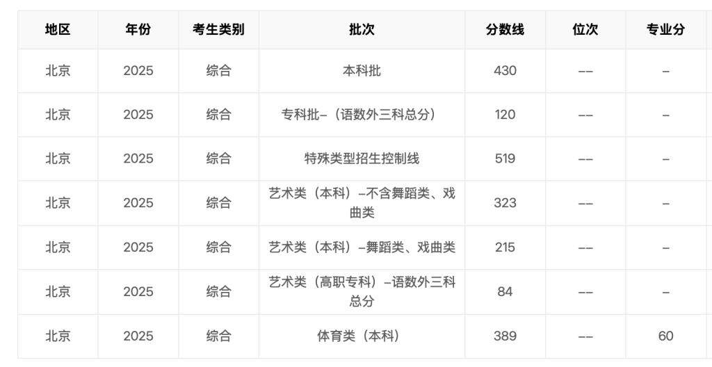 提示: 2017年起本科二批、本科三批合并至本科二批;专科一批合并至专科批 2019年起本科一批、本科二批合并至本科批 2020年起不再区分文理科 未经允许不得转载:笔仙儿 » 2025年北京市高考分数线